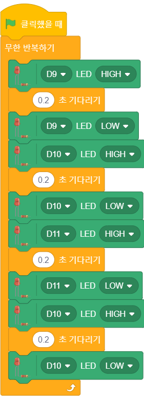 녹색 깃발을 누르면 아래 그림과 같이 LED가 무한반복으로 동작되게 해보세요.